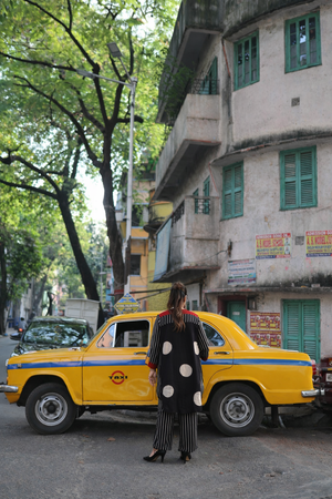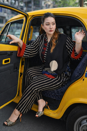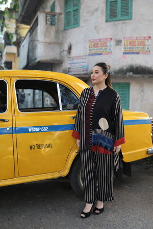 A statement co-ord set featuring bold vertical stripes and geometric patterns in black, highlighted with accents of red, white, and blue. The hi-low relaxed shirt is designed for everyday social and professional commitments, seamlessly transitioning from office wear to after-office style while embodying a sustainable ethos. Model height is 5'5" and is wearing a size L.