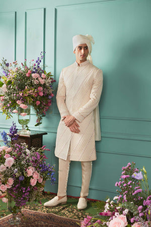 A magnificent glacier-white sherwani set fabricated in a textured fabric and crafted in a hand-embroidered zardozi and thread work in a beautiful design. The sherwani has full sleeves and a mandarin collar, comes with matching kurta and bottoms