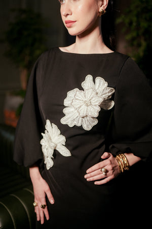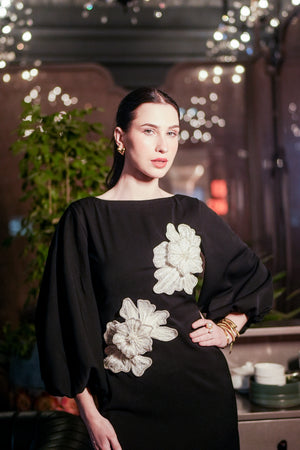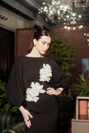 A black dress with 3D white embroidered handmade flowers is absolutely exquisite! The contrast of the black dress with the delicate white embroidered flowers adds a touch of elegance and uniqueness to the outfit. It's a beautiful choice for a special event or a formal occasion, guaranteed to make you stand out in style.
