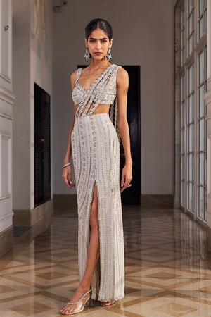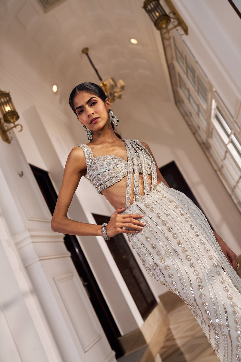 This stunning saree in silver color has overall embroidery on the garment. It has slit on the skirt and very stylish very different kind of palla.