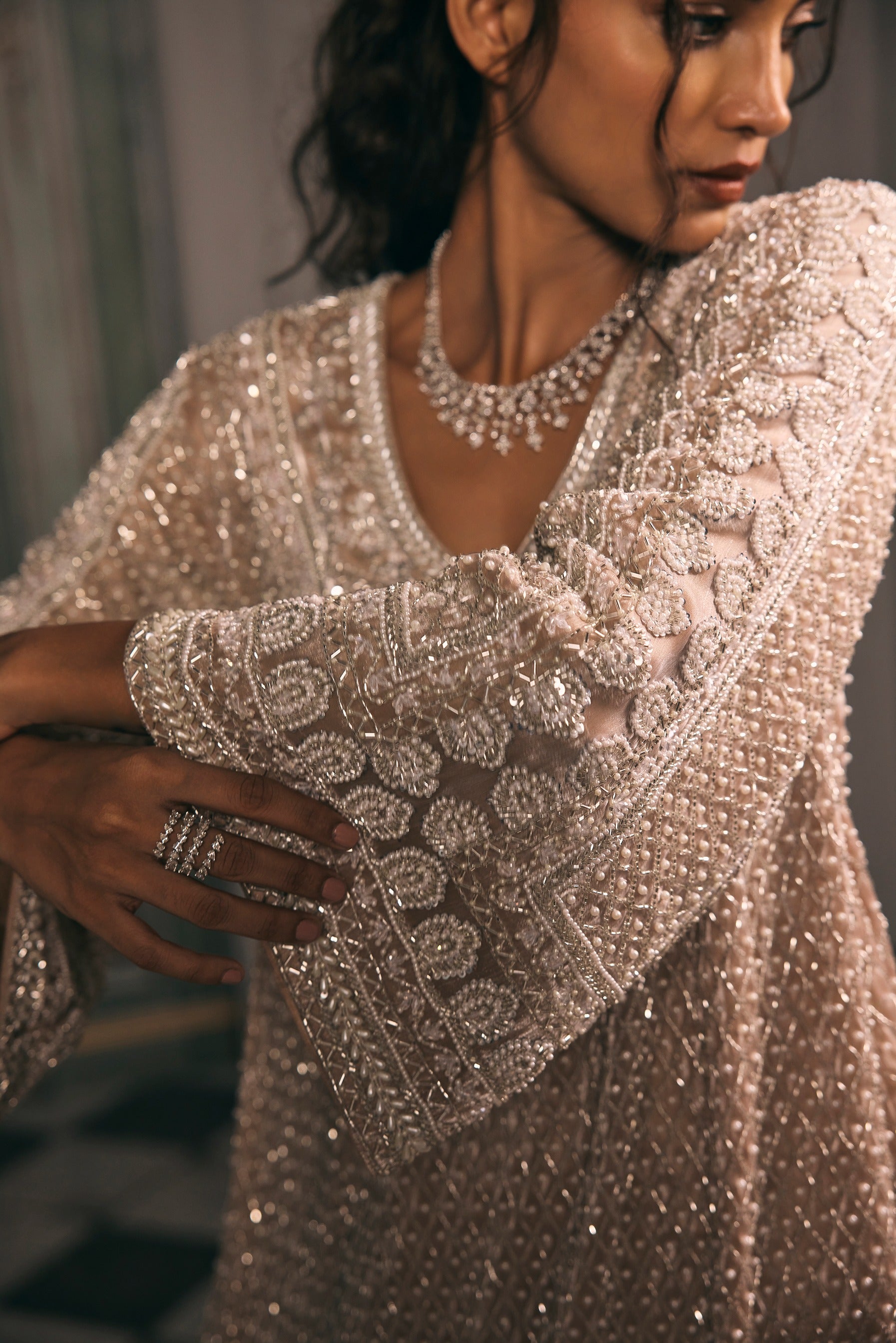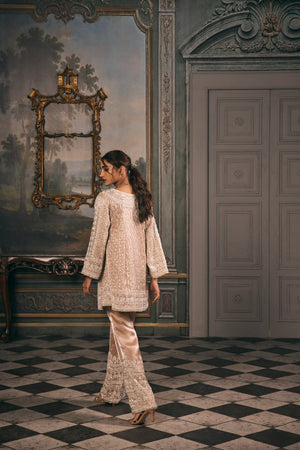 Effortless elegance meets artisanal mastery in this champagne kurta set, crafted for the woman who appreciates understated luxury. The short A-line kurta is adorned with intricate hand embroidery, brought to life with delicate white and silver threads that shimmer with refined grace. The artistry extends to the exquisite sleeve detailing, offering a modern yet timeless touch that elevates the silhouette. Paired with straight-cut pants, the ensemble exudes sophistication while ensuring effortless wearability. The champagne base provides the perfect canvas for the embroidery to stand out, making this look both versatile and striking. Ideal for weddings, festive gatherings, and elegant evening celebrations, this set embodies a balance of tradition and contemporary charm. Complete the look with diamond or polki jewellery and embellished heels for an ensemble that speaks volumes in quiet luxury.