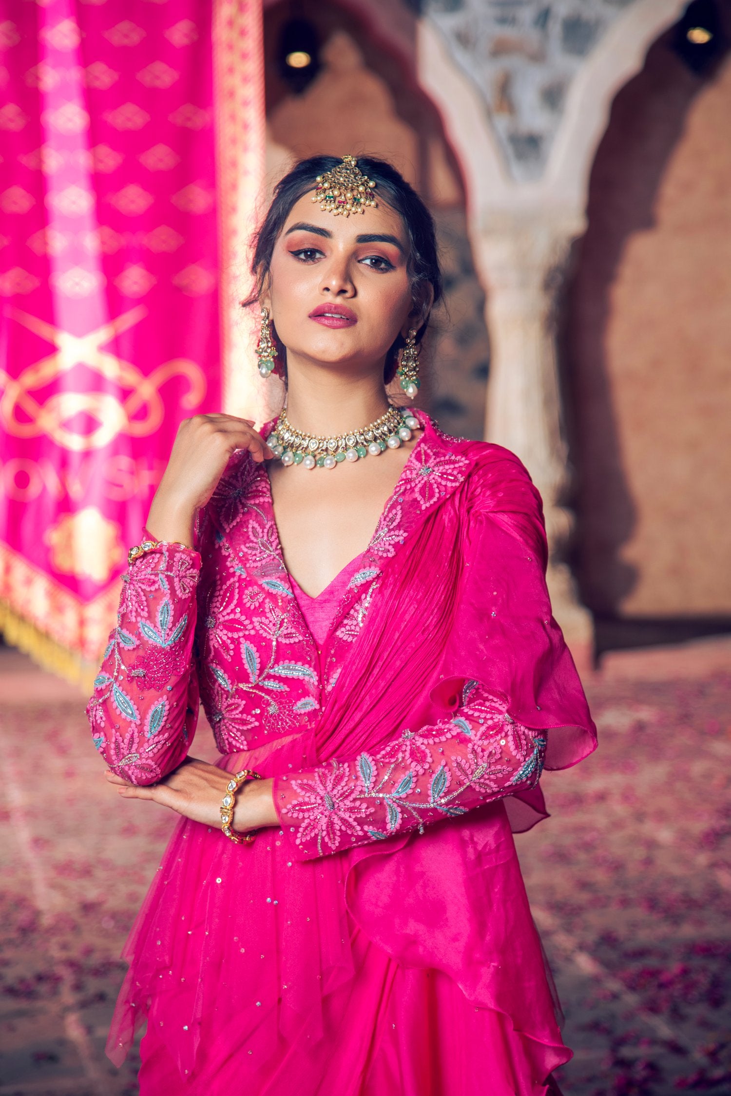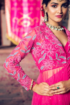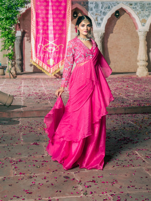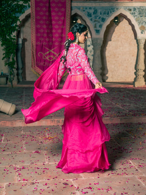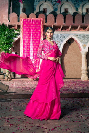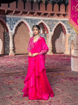 Featuring a Sequins, Beads, Cutdana, Naka Tiki and Badla Dori hand embroidered Peplum in Net base paired with Chiffon and Organza Ruffle Drape Saree and Raw Silk Bustier