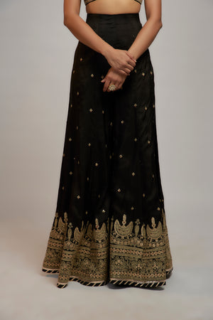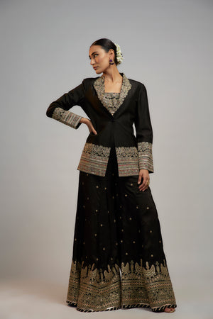 Revel in sophistication pulling attention to the intricate patterns and a sharara/blazer silhouette for a contemporary look. This set is a perfect blend of modern sensibilities and traditional craftsmanship.