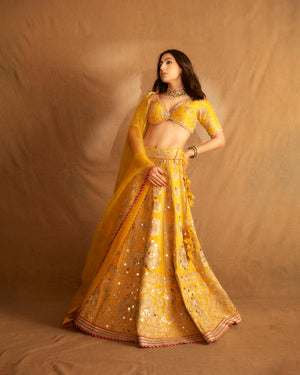 Inspired by the rich history, vintage textiles, and breath-taking embroideries, this vibrant ensemble features exquisite marodi work with a shimmer of sequins. The billowing skirt showcases the classic chandbali motif, paired with a sleeved choli adorned with zardosi work. The soft organza dupatta adds a delicate touch, telling a story of love, passion, heritage, and beauty. The perfect ensemble for the bold bride, embracing the spirit of today in the timeless romance of fashion