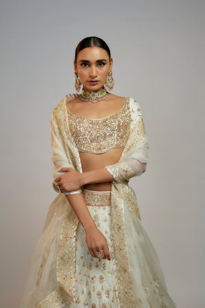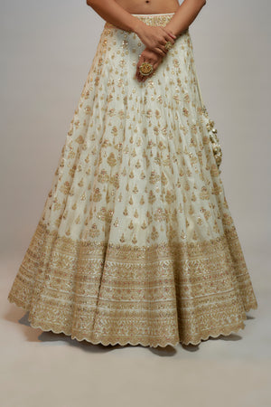 This stunning lehenga, embellished with exquisite gold detailed zardosi work, reflects the geometry and design of Indian traditional style inspired by the rich history it entails.