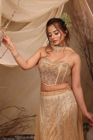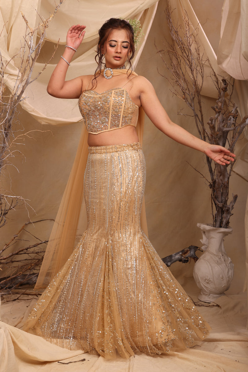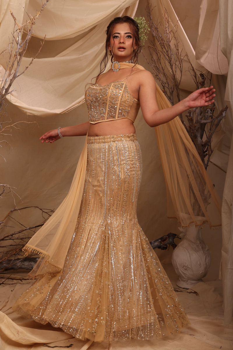 Gold corset blouse paired with a mermaid skirt and a tulle dupatta featuring cutdana, nalki, sequins, crystals all over