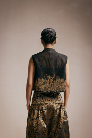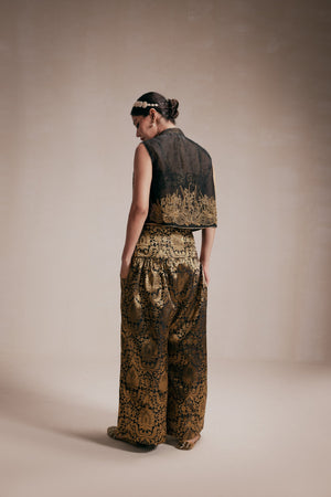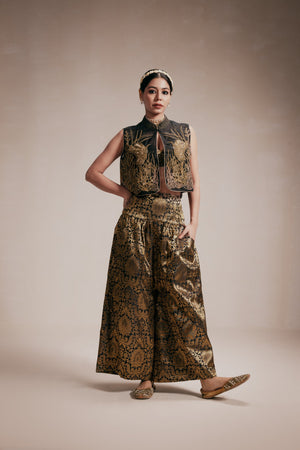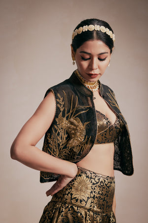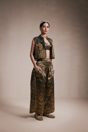A luxurious gold-embroidered jacket on a Chanderi base, paired with brocade Korean pants and a matching brocade bustier