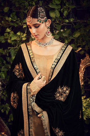 Featuring a gold kurta in silk zari tissue base. It is paired with matching gharara pants and an emerald green silk velvet dupatta shawl having zardosi embroidered bootis.