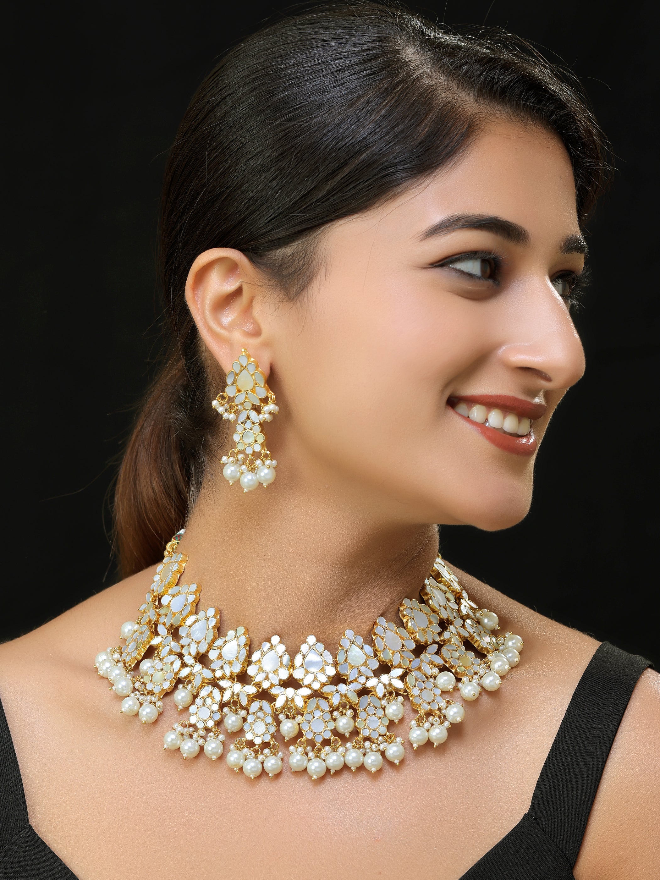 Gold finish Kundan and mother of pearls necklace set wih pearl drops