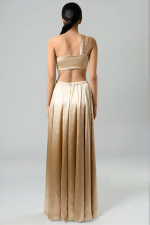 Make a bold statement in our Gold One Shoulder Dress, perfect for evening events or cocktail parties. This stunning dress features a sleek one-shoulder design that exudes elegance and sophistication. The shimmering gold fabric ensures you stand out, while the flattering fit enhances your silhouette. Ideal for any special occasion, this dress combines glamour and style effortlessly. Elevate your evening wardrobe with this show-stopping piece. Care Instruction:- Dry Clean Only
