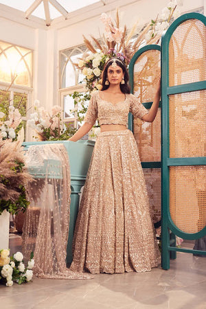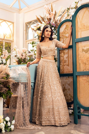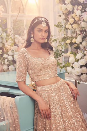 Featuring heavily full hand embroidered organza lehenga. The blouse is heavily embroidered. Paired with a same color dupatta. This piece comes with a cancan.
