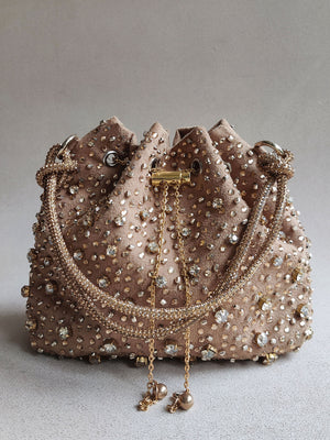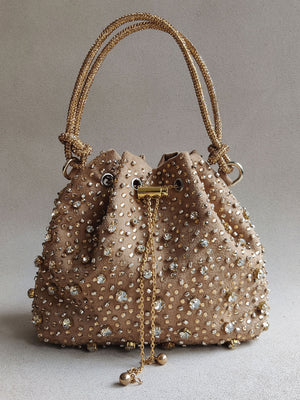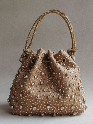 Gold Hand Embellished Bucket Bag in 100% Vegan Suede featuring a Rhinestone Handle.