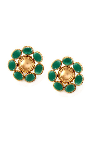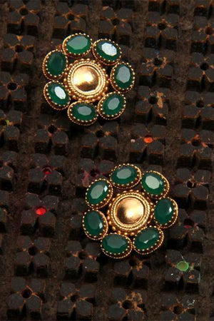 Gold Toned Circle Stud Earrings With Green Crystals