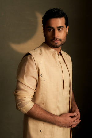 This men’s kurta pyjama set blends timeless style with celestial accents. The long-sleeved kurta features an extended front yoke adorned with delicate star motif embroidery, accented by a few glass crescent moons placed along the yoke edge. Layered with a long open jacket showcasing similar embroidery, the set is paired with straight pyjamas for an understated yet elegant festive look.