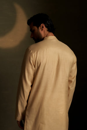 This men’s short kurta in mul chanderi carries a refined, understated charm. Subtle star motifs and glass crescent moon embroidery accent the placket, adding a delicate celestial detail. Paired with classic pyjamas, it’s a versatile choice that blends festive appeal with timeless style.