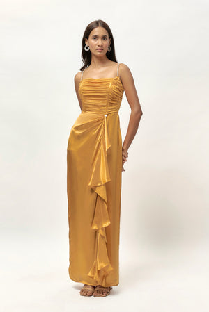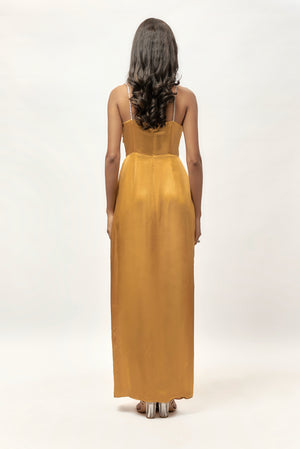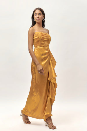 A dazzling golden drape dress featuring a stunning embellished corset that defines elegance and allure. With its flowing silhouette and radiant sparkle, it?? the ultimate choice for a glamorous evening.