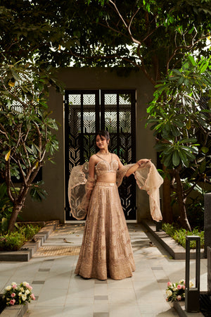 Elevate your elegance with our Tuscan Beige Lehenga Set, a masterpiece of timeless craftsmanship. This three-piece ensemble features a lehenga and blouse crafted from luxurious raw silk, adorned with intricate gold zari embroidery and dazzling mirror work throughout. The blouse is exquisitely studded with delicate pearls, adding a touch of opulence. Paired with a lightweight net dupatta that echoes the intricate detailing, this set is perfect for weddings and grand celebrations, ensuring you shine with effortless grace.