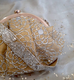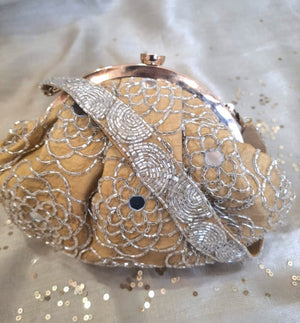 A blend of golden and silver with the Shisha embroidery, with shisha representing the bling of a swarovski is such a rare combination with so much elegance. This Golden Monotone soft clutch has a hand embroidered handle, light weight and spacious enough to carry all your essentials for the eve.!
