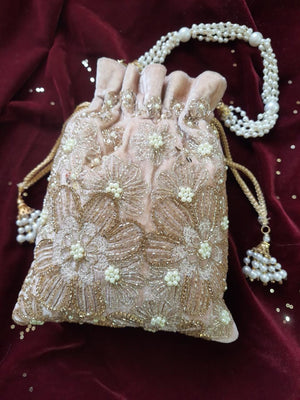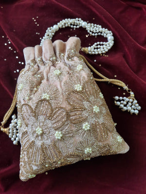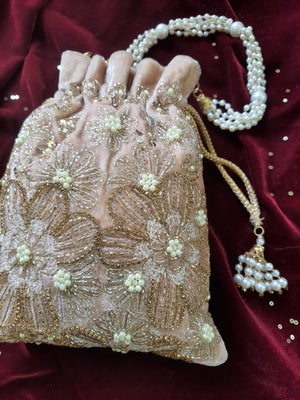 Our Regal Velveteen Potli Bag is made of fine quality swarovski adding the bling effect of our JUNO collection. The velevt base and pearl handle just accentuates the look fruther more. Made with hours of hard work and put together by skilled indian craftsmen, this potli bag is just the kind of royal regal look you want to add to your outfit.