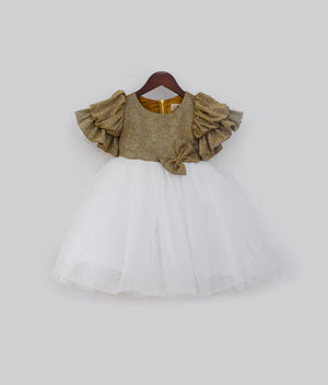 Elevate your little one's style with our Golden Shimmer Off-White Glitter Net Frock. The golden shimmer yoke, adorned with bows at the front and back, complements the bell sleeves and piko finishing, creating a charming ensemble. The glitter net frill adds a touch of playfulness, while the cotton base lining ensures comfort throughout the day. Perfect for birthdays, the frock's flair features a plain net layer for added allure, and with no cancan, it allows for easy movement and a delightful celebration. Let your child shine bright and twirl with joy in this enchanting birthday-perfect frock.