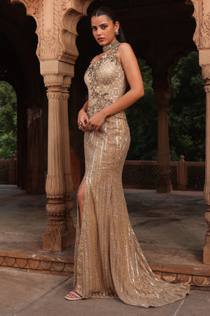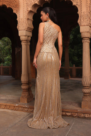Golden chantelley long corset with 3D hand embroidered flowers , paired with sequin handwork skirt to complete the look.