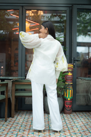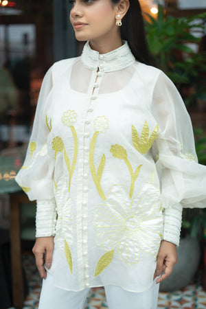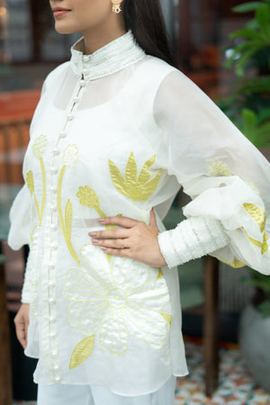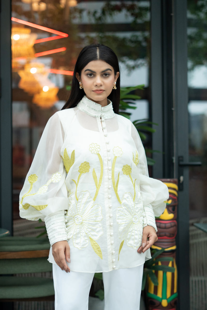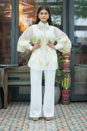 Step into effortless elegance with this breezy co-ord set, featuring an oversized high-neck shirt adorned with delicate green botanical embroidery. this top blends comfort with refined detail. Perfect for day-to-evening transitions, casual get-togethers, or modern festive wear.