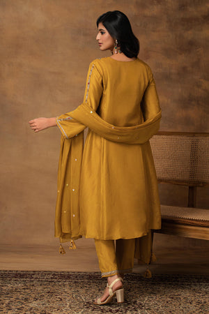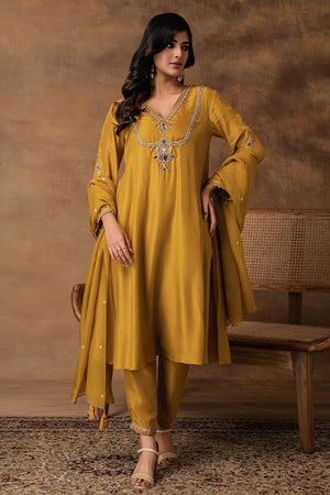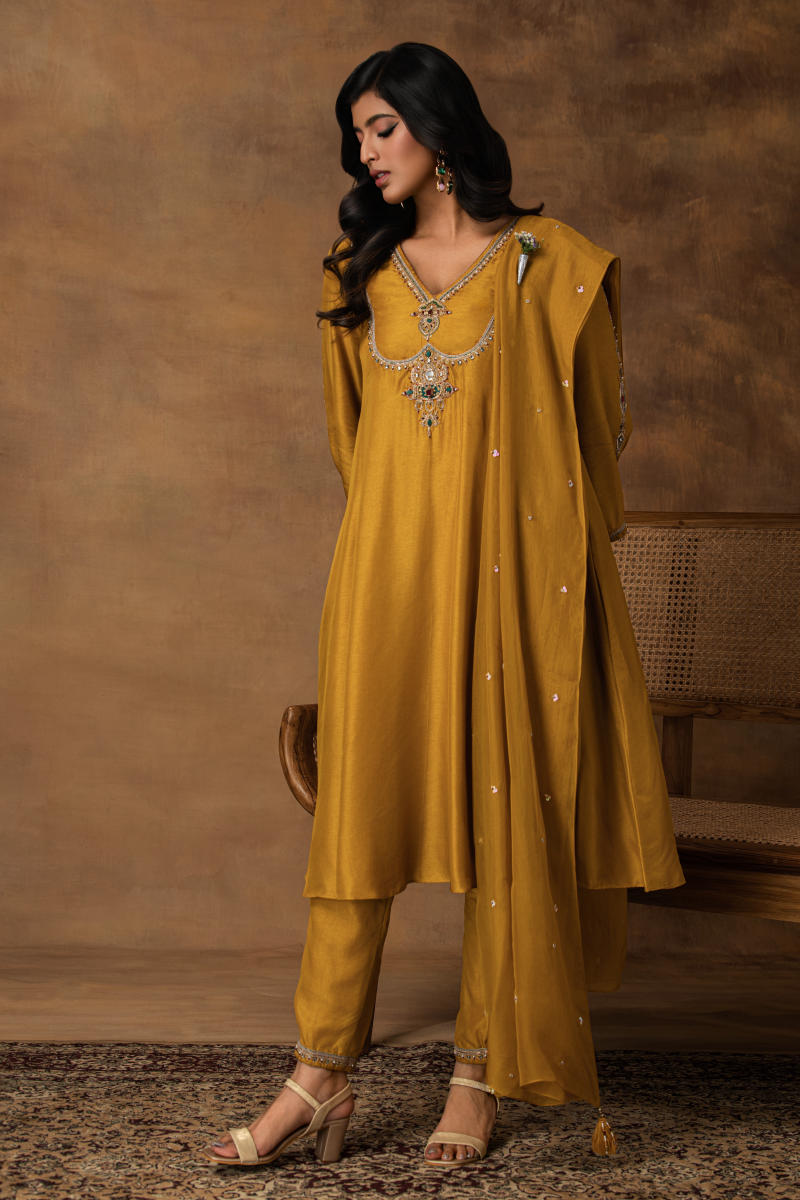 Featured here is silk Kurta set in golden yellow hue, cut in an easy, fluid silhouette. The neckline draws inspiration from vintage royal jewellery, shaped like an elegant neck piece. The sleeves and straight pants feature tonal and rose gold embroidery that reflect the symmetry of jaali windows and jharokhas, bringing architectural grace to the ensemble. Finished with a featherlight embroidered organza dupatta, the set flows effortlessly — perfect for warm, festive days and intimate celebrations.