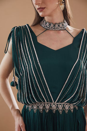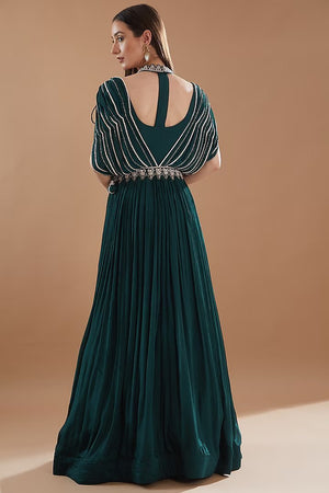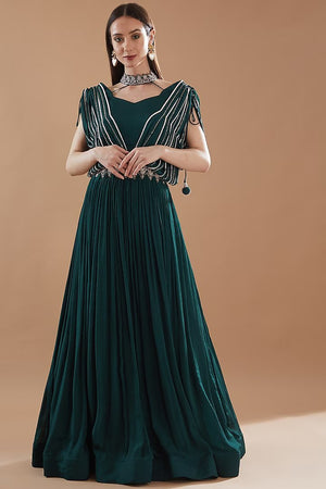 Bottle Green Gathered Gown Comes with Atteched Embroidered Choker Neck.