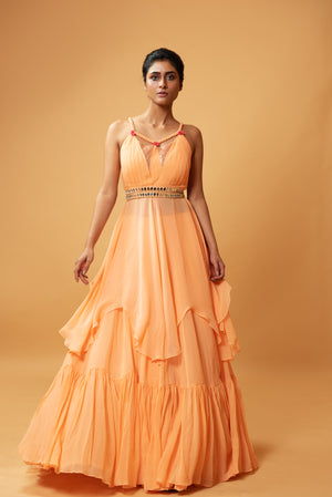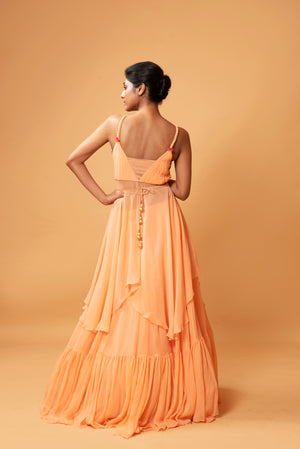 Featuring A Peach Coloured Sleeveless Co-Ord Set With Sequins And Drape On The Top And Flared Lehenga Skirt With Ruffle At The Bottom. It Has A Mirror Embellished Hand Embroidered Waist Belt.