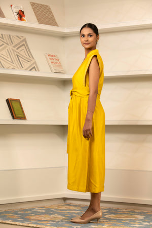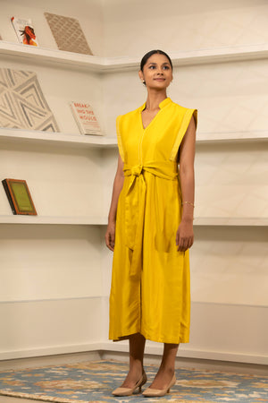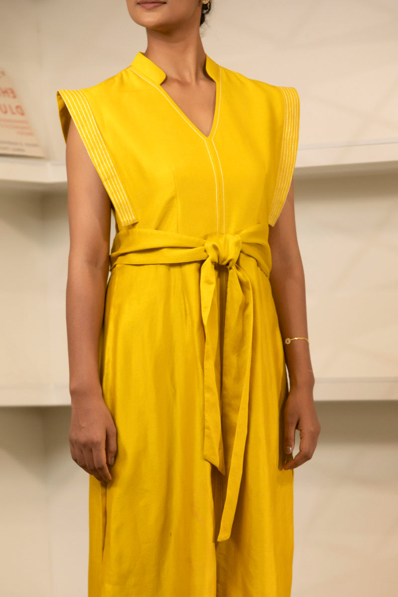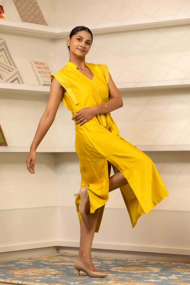 A sleeveless dress with a semi-collar and a V-neck. The detachable belt adds versatility, while the front slit ensures a chic and contemporary style.