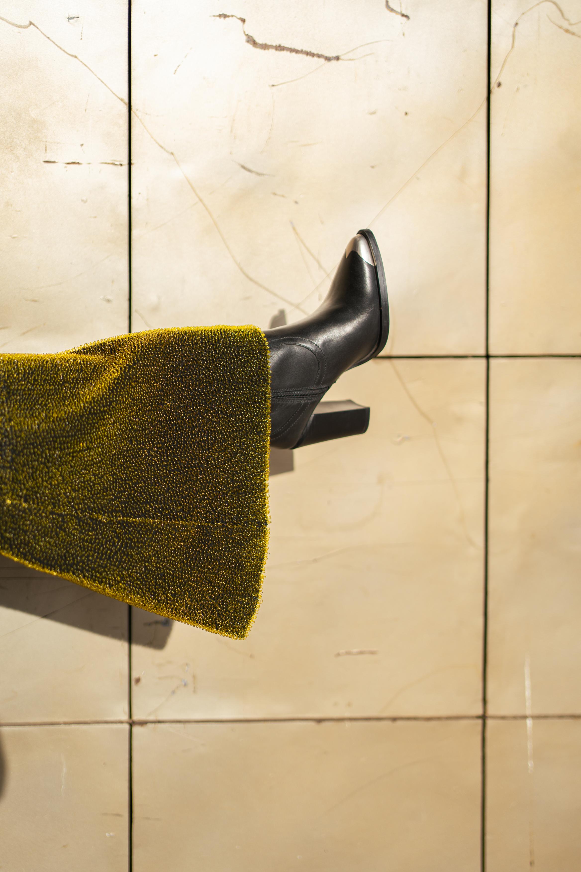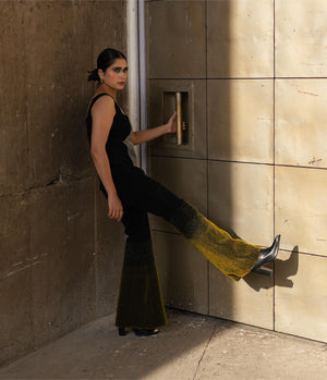 slash side pocket bell bottom, featuring gradated loop hand embroidery throughtout knee to hem, fully lined, high waist