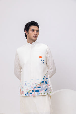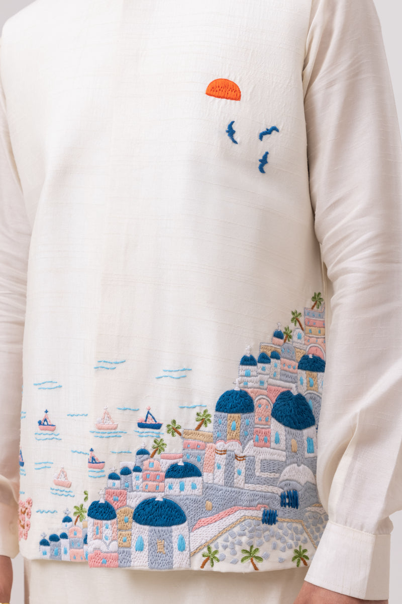 A breezy ivory Nehru jacket that captures the essence of a Mediterranean escape. With hand-embroidered domes, sea gulls, palms, and sunset hues, this jacket tells a slow-travel story of Grecian rooftops and coastal charm.