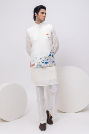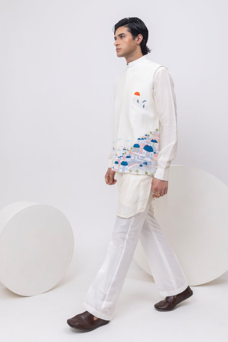 A breezy ivory Nehru jacket that captures the essence of a Mediterranean escape. With hand-embroidered domes, sea gulls, palms, and sunset hues, this jacket tells a slow-travel story of Grecian rooftops and coastal charm.