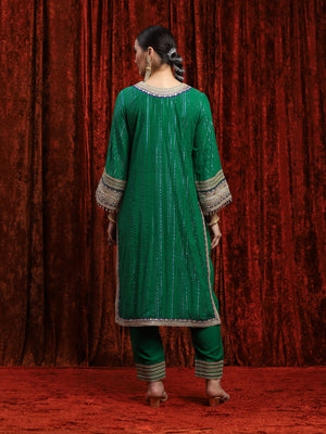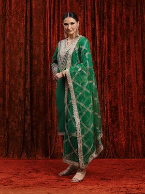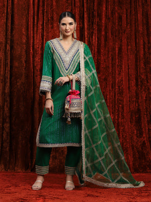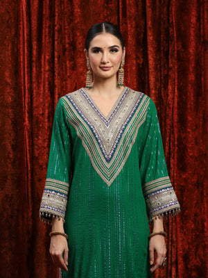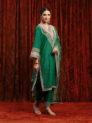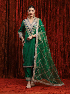 Experience the captivating fusion of colors with our Green and Blue kurta, pant and dupatta set, embellished with intricate Gota, Dori and Badla work. The ensemble’s elegance is elevated with a net dupatta that gracefully drapes and a luxurious silk chanderi pants. The V neckline of the cotton shimmer kurta, adds a touch of modernity to its classic design. This ensemble exemplifies a harmonious blend of traditional and contemporary style.