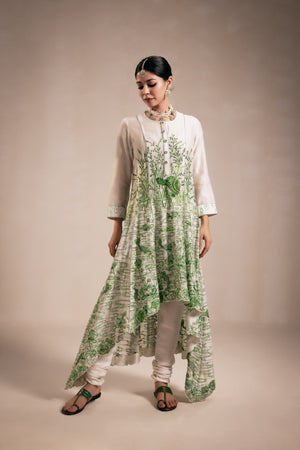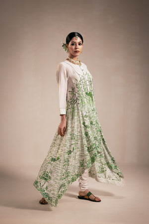 Ivory high-low fully machine & hand emb. kalidaar kurta with churidar & dupatta