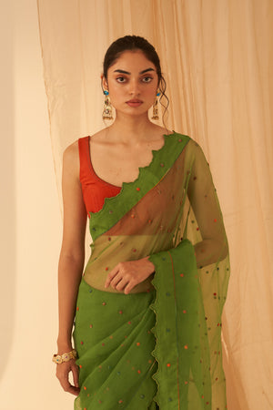A beautifully crafted green Chanderi-organza saree featuring delicate cross taanka embroidery and a scalloped border, making it a timeless piece. Paired with an organic cotton stitched petticoat, this ensemble blends elegance with contemporary charm. Perfect for festive and special occasions! (Blouse & Petticoat are not the part of this saree, those are used only for photo shoot purpose )