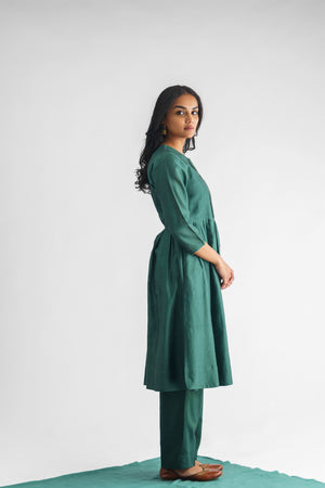 Green cotton silk pants with an elasticated waist and front dori tie-up.