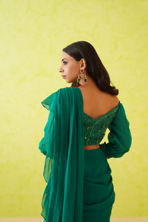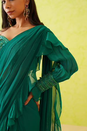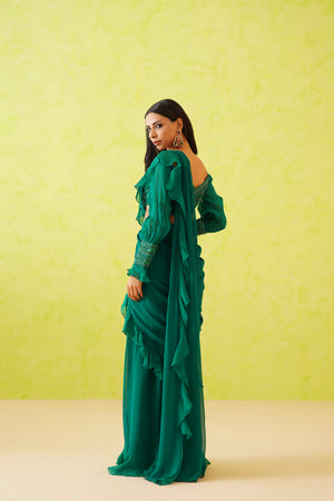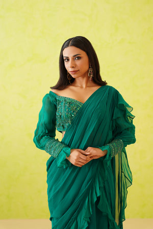 Deepika Chadha's stunning green draped saree with an embellished blouse. The blouse is enhanced with tonal sequins, crystal, stones and bead embellishments detailing in floral patterns. The saree features a flowy, full-length modern look with a flowy silhouette with frill.