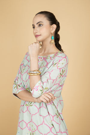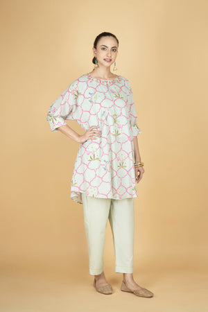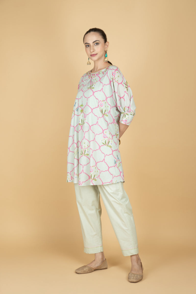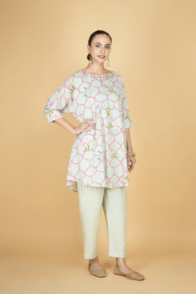 Green Embroidered Floral Print Short Kurta with Solid Pants