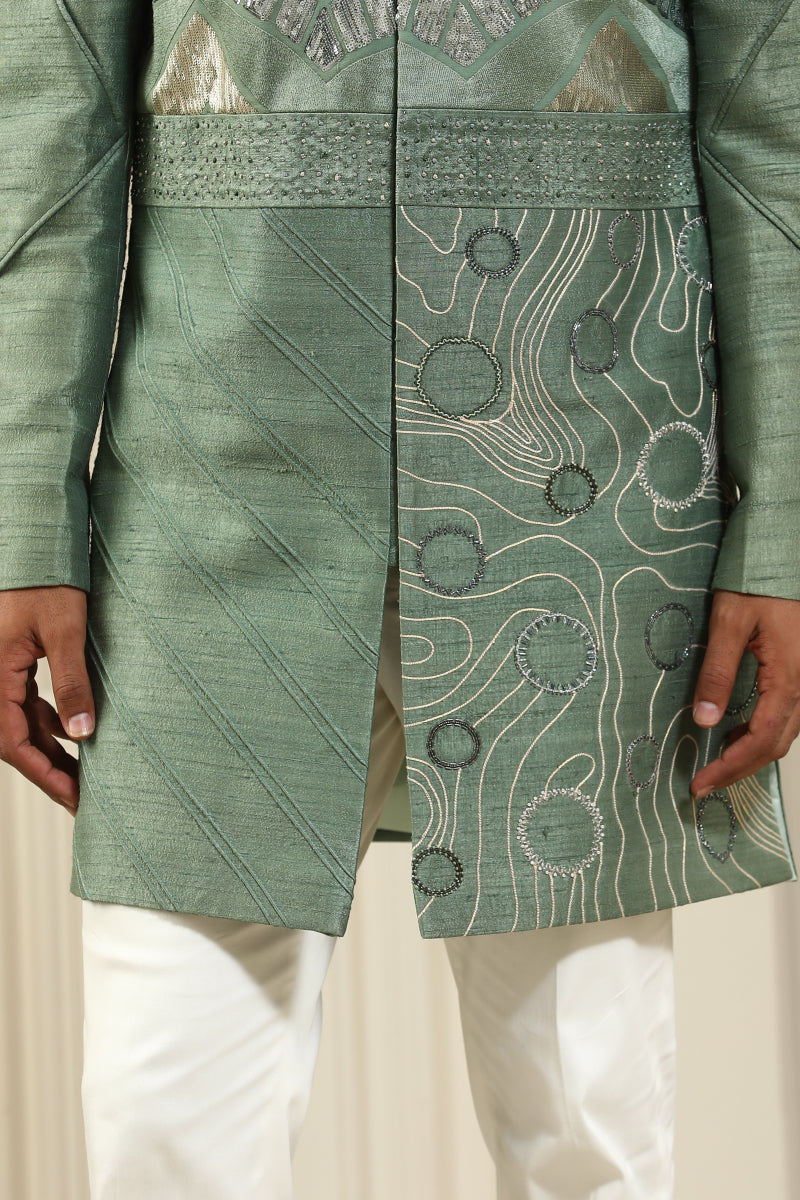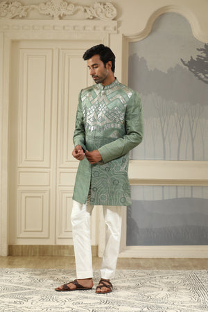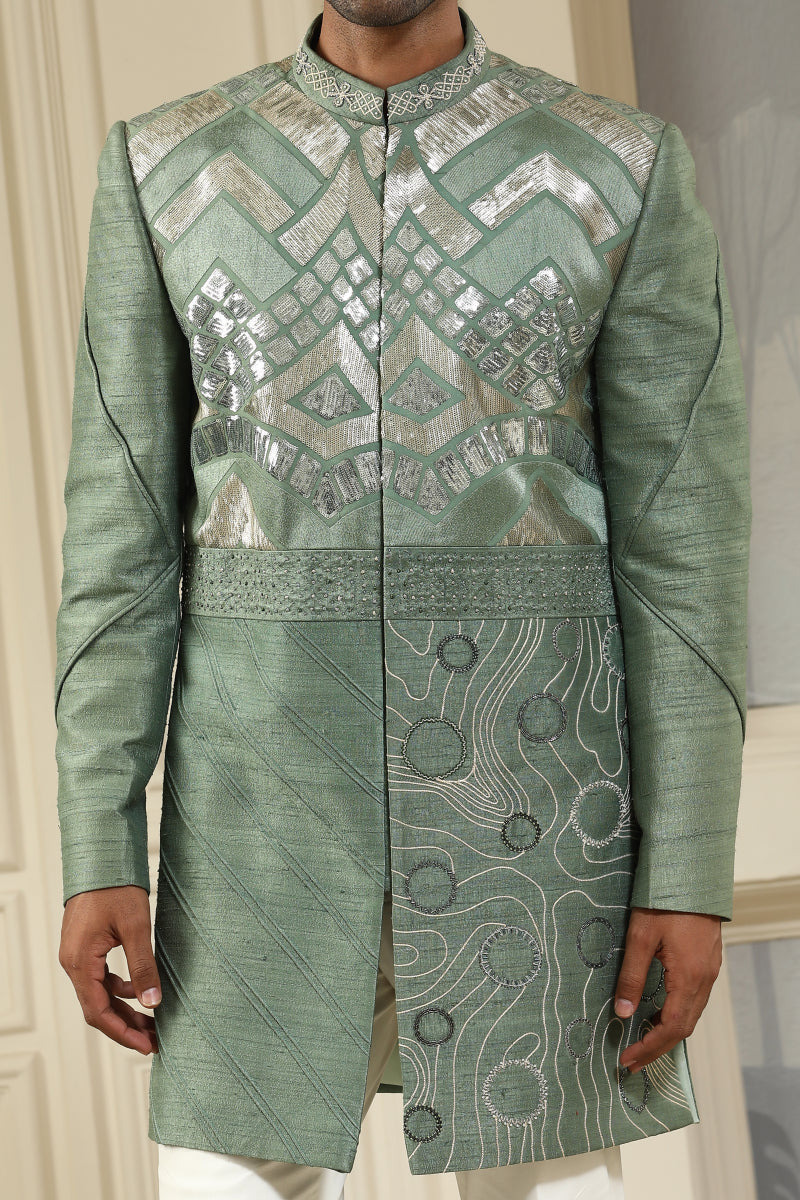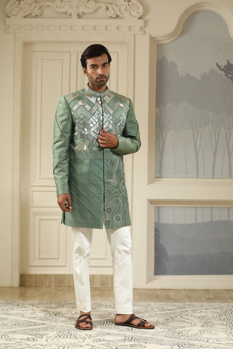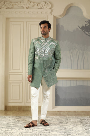 This green short Indo-western set is a striking blend of structure and surface detailing. The top half of the garment features intricate geometric embroidery done with dori and other hand techniques, adding depth and dimension. Tailored in a modern silhouette and paired with off-white lycra pants, it’s a contemporary festive look with rooted elegance.