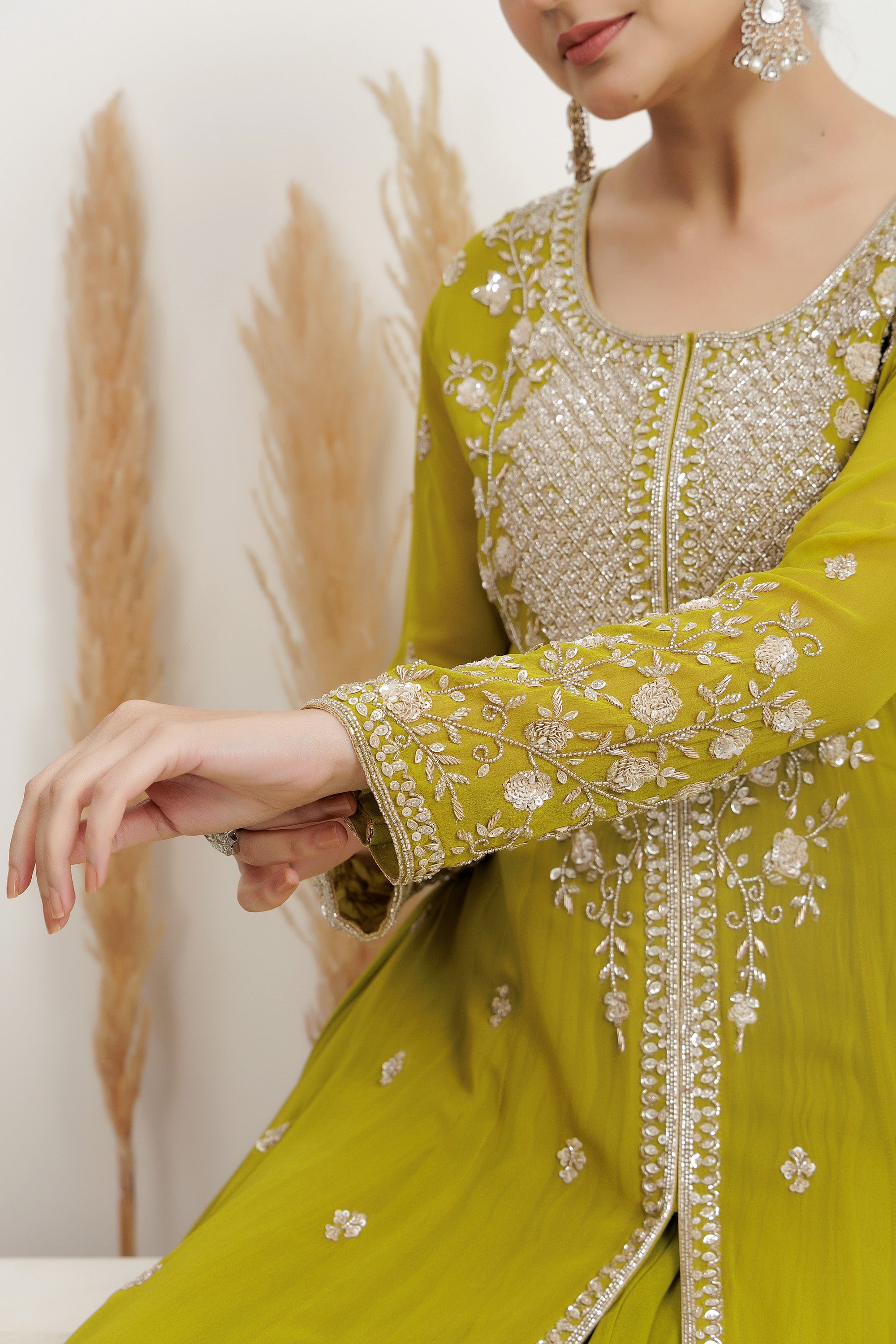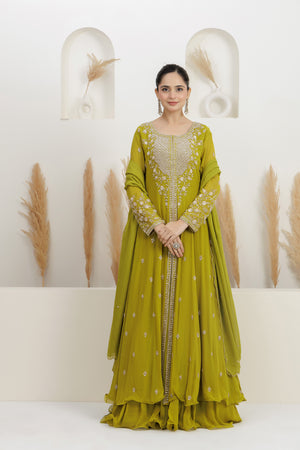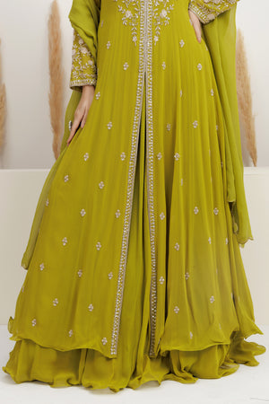 green double layered anarkali in georgette base with cutdana, pearl and sequins embroidery comes with sccalpas Dupatta.