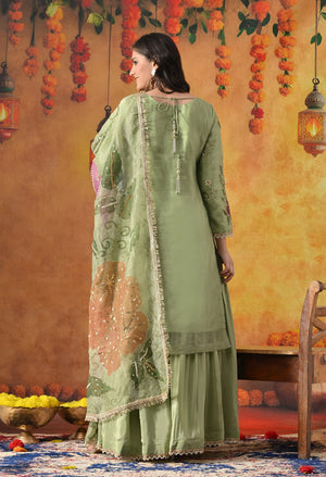 This elegant green gharara set is meticulously hand crafted and hand embroidered, showcasing rich zardozi and dabka work enhanced with delicate pearls, subtle sequin accents, and refined hand-painted details. The sheer organza kurta and dupatta paired with a fluid crepe gharara create a graceful silhouette, making this ensemble a timeless choice for haldi, mehndi, and festive celebrations.