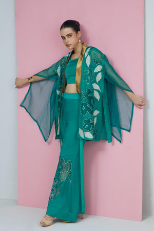 Green Zari Applique Lapel Cape With Bustier And Sheer Applique Boot Cut Pants