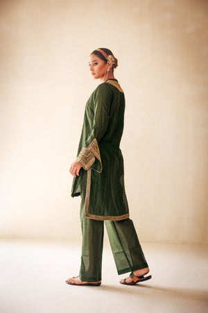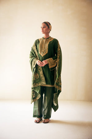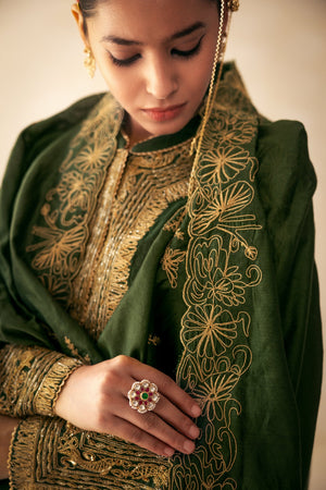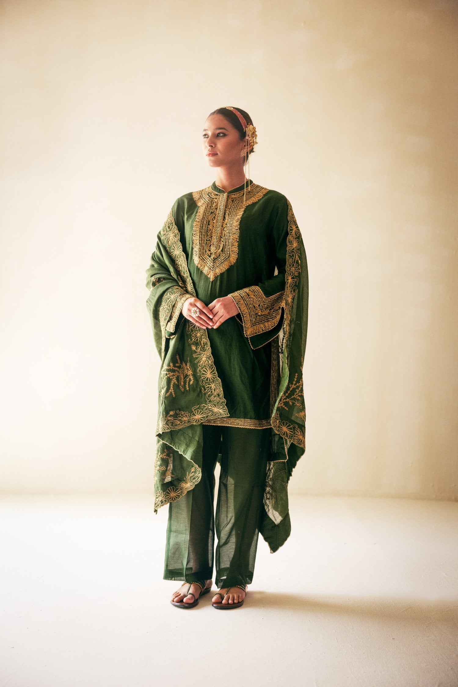 Green crafted sleeves chanderi kurta in gold embroidery on yoke with trouser & dupatta