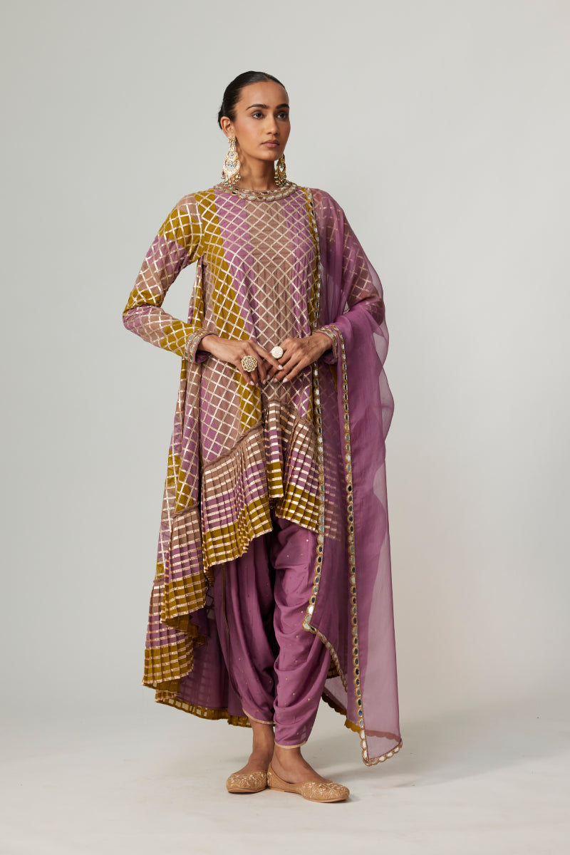 A Vibrant Multicolor Kurta In Deep Beige, Mud Mauve, Green Tones, Adorned With Golden Gota Embroidery, Paired With A Scattered Sequins Dhoti And Dupatta Set