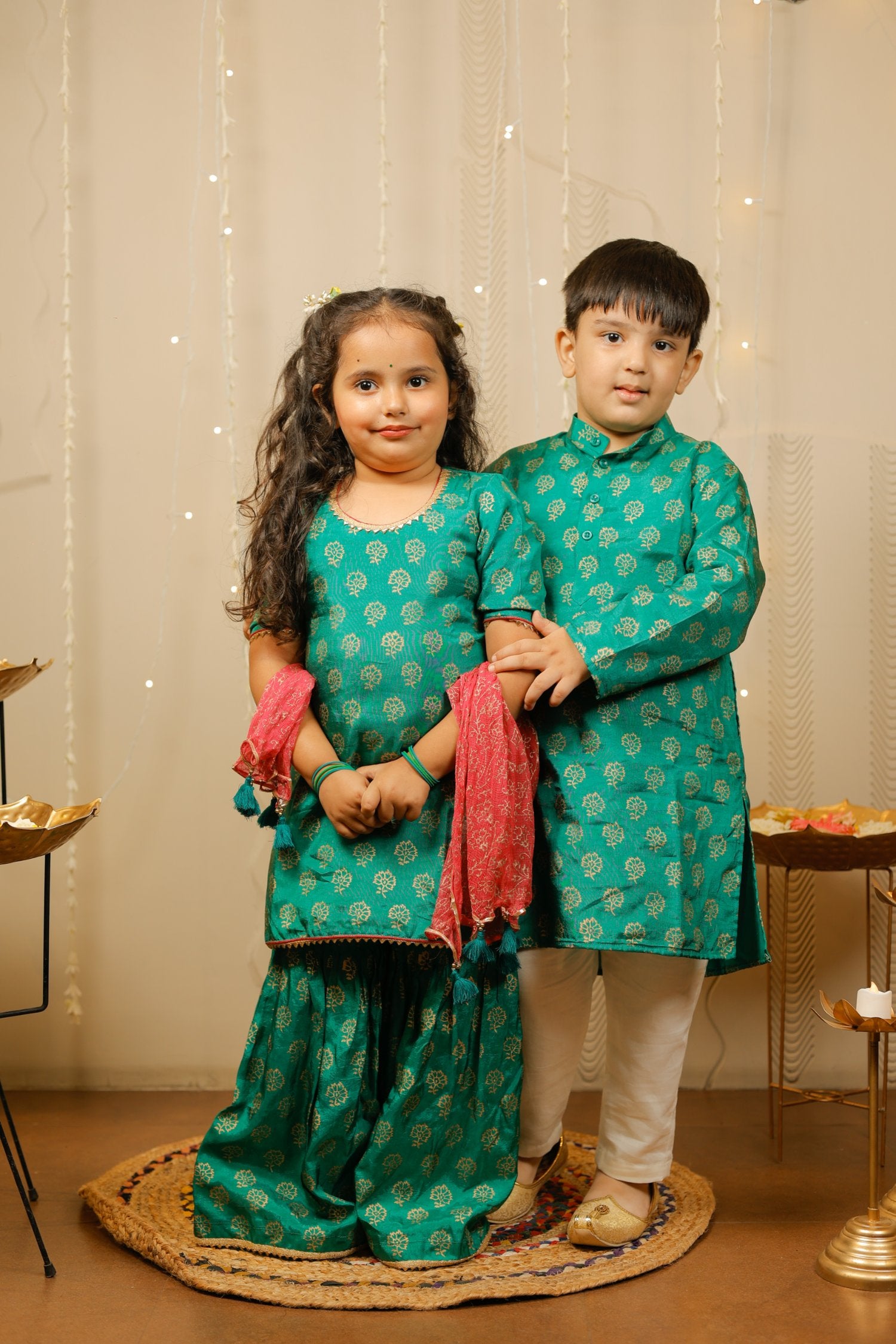 Kurta is paired with sharara and dupatta. They are sold as a set