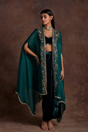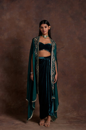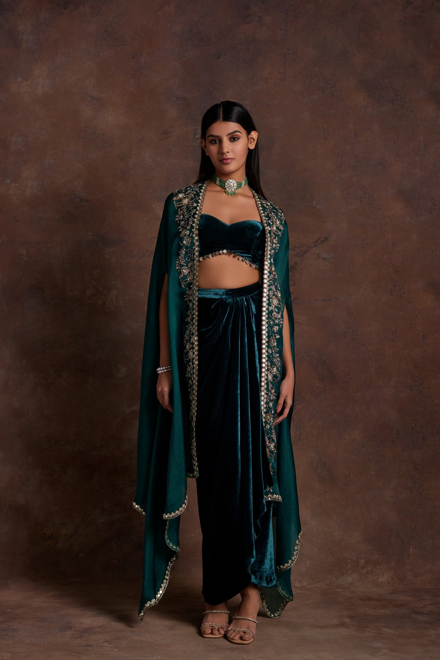 Green Velvet Drape Skirt Bustier And Organza Cape