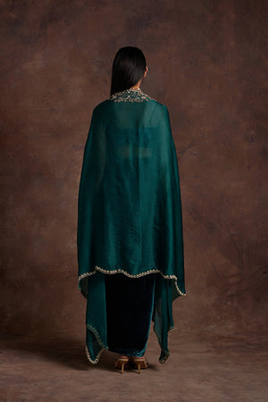 Green Velvet Drape Skirt And Bustier With Coin Hangings At The Hem. It Is Paired With An Organza Cape With Hand Embroidery All Across The Front And Hem.