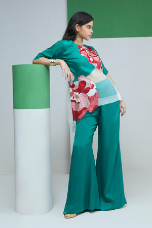 Green White Organza Red Bloom Applique Top With Boot Cut Pants