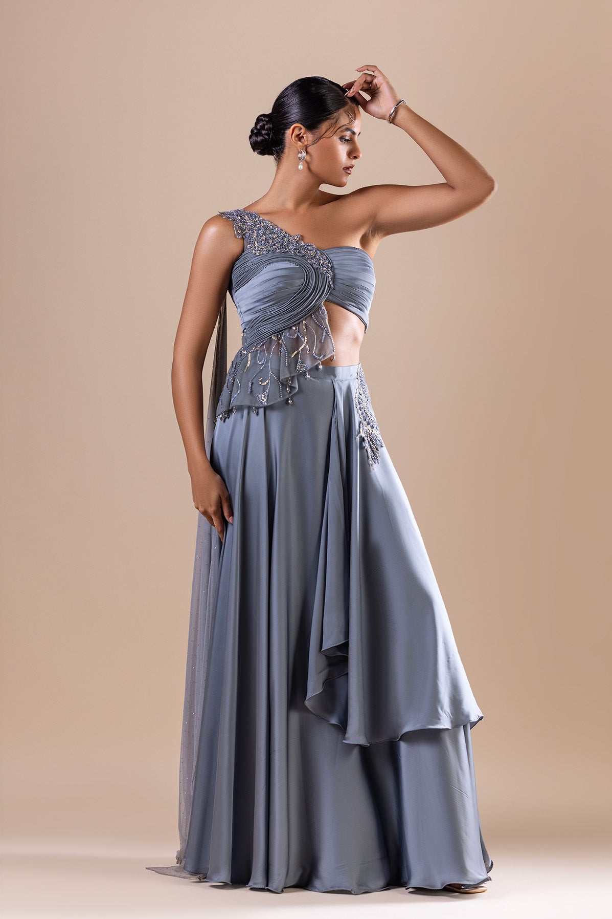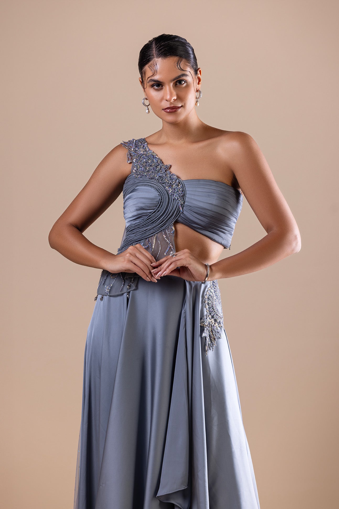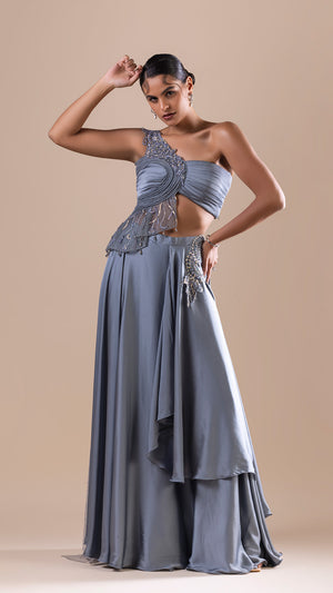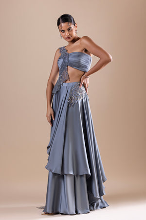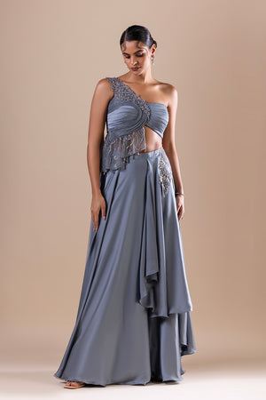 Grey in Armani satin Skirt with crystal, cutdana, sequins, and Swarovski embroidery. It is paired with a matching Embroidered Crop Top